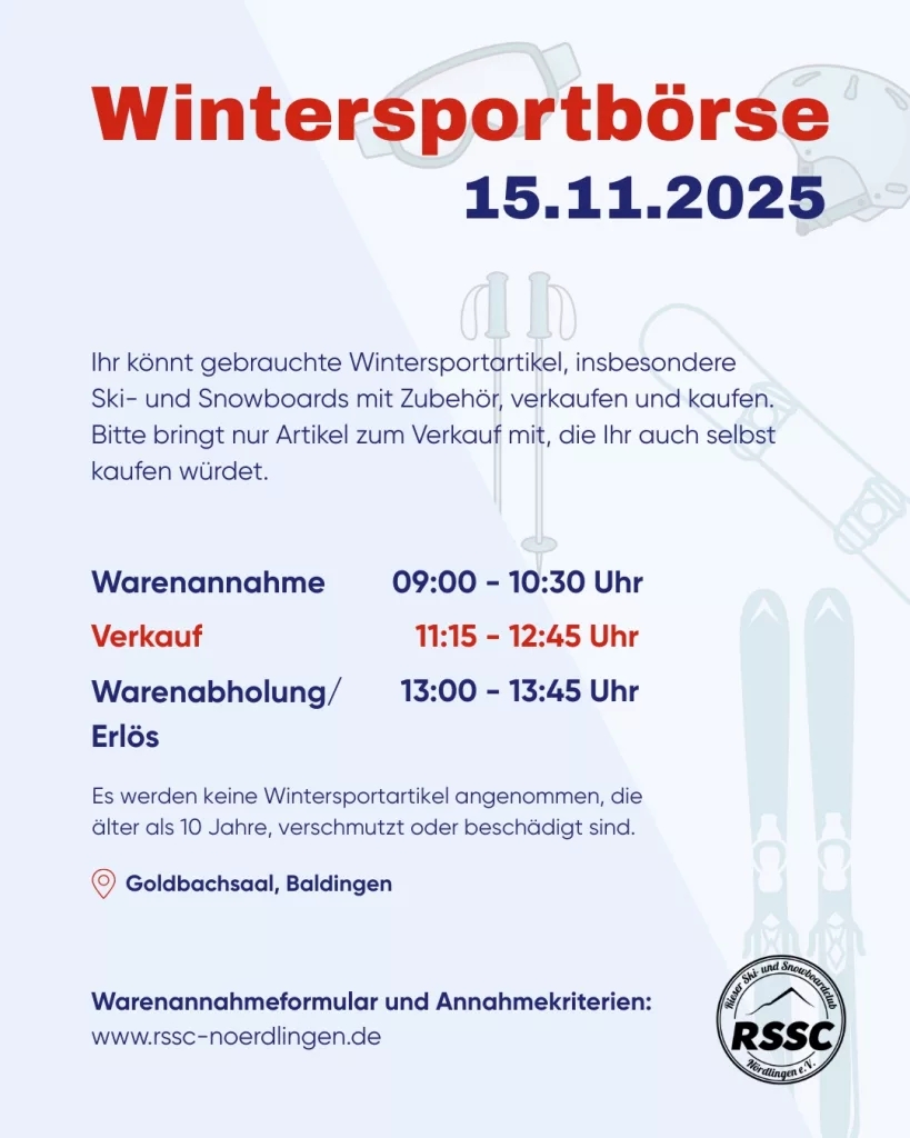 Am 15. November 2025 findet diese Jahr wieder unsere Wintersportbörse im Goldbachsaal in Baldingen statt! Hier könnt Ihr gebrauchte Wintersportartikel, insbesondere Ski und Snowboards mit Zubehör, verkaufen und kaufen. Besonders gefragt sind Ski- und Wintersportbekleidung für alle Altersgruppen. Bitte bringt nur Artikel zum Verkauf mit, die Ihr aufgrund ihres Alters und Zustands auch selbst kaufen würdet.