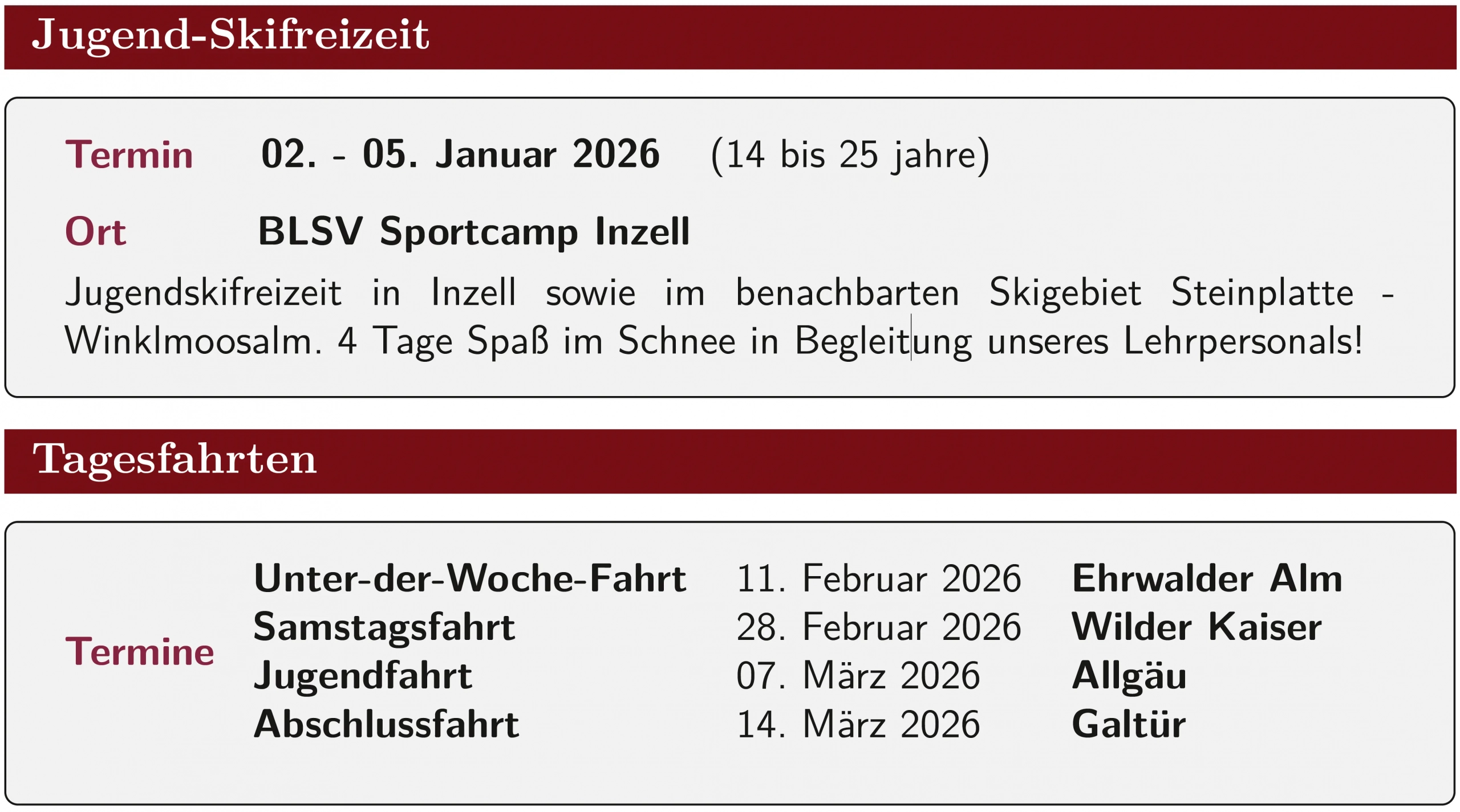 Da die Schneebedingungen mittlerweile nicht mehr ganz so planbar sind, behalten wir uns vor die Zielorte bei Bedarf anzupassen. Alle Details sowie Abfahrtszeiten und Preise findet ihr wie gewohnt auf unserer Anmeldeplattform.